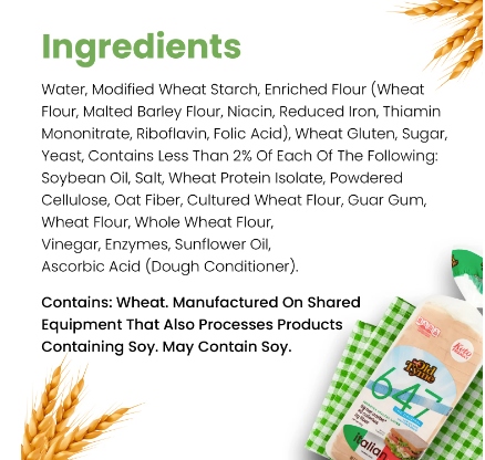 Water, Modified Wheat Starch, Enriched Flour (Wheat Flour, Malted Barley Flour, Niacin, Reduced Iron, Thiamin Mononitrate, Riboflavin, Folic Acid), Wheat Gluten, Sugar, Yeast, Contains Less than 2% of Each of the Following: Soybean Oil, Salt, Wheat Protein Isolate, Powdered Cellulose, Oat Fiber, Cultured Wheat Flour, Guar Gum, Wheat Flour, Whole Wheat Flour, Vinegar, Enzymes, Sunflower Oil, Ascorbic Acid (Dough Conditioner).