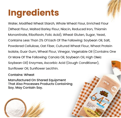 Water, Modified Wheat Starch, Whole Wheat Flour, Enriched Flour (Wheat Flour, Malted Barley Flour, Niacin, Reduced Iron, Thiamin Mononitrate, Riboflavin, Folic Acid), Wheat Gluten, Sugar, Yeast, Contains Less than 2% of Each of the Following: Soybean Oil, Salt, Powdered Cellulose, Oat Fiber, Cultured Wheat Flour, Wheat Protein Isolate, Guar Gum, Wheat Flour, Vinegar, Vegetable Oil (Contains One or More of the Following: Canola Oil, Soybean Oil, High Oleic Soybean Oil), Enzymes, Ascorbic Acid (Dough Conditioner), Sunflower Oil, Sunflower Lecithin.