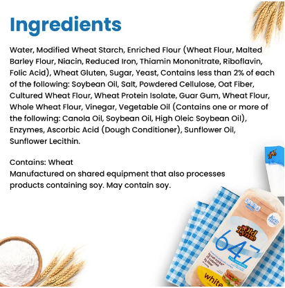 Water, Modified Wheat Starch, Enriched Flour (Wheat Flour, Malted Barley Flour, Niacin, Reduced Iron, Thiamin Mononitrate, Riboflavin, Folic Acid), Wheat Gluten, Sugar, Bamboo Fiber, Yeast, Contains 2% Or Less of Each of The Following: Soybean Oil, Salt, Calcium Sulfate, Monoglycerides, Calcium Propionate (A Preservative), Wheat Flour, Sodium Stearoyl Lactylate, Wheat Starch, Guar Gum, Enzymes, Ascorbic Acid (Dough Conditioner), Sucralose, Ammonium Sulfate, Calcium Peroxide, Ascorbic Acid (Dough Conditioner), Sucralose, Ammonium Sulfate, Calcium Peroxide, Ascorbic Acid (A Preservative), Citric Acid (A Preservative). Contains Wheat and Soy.