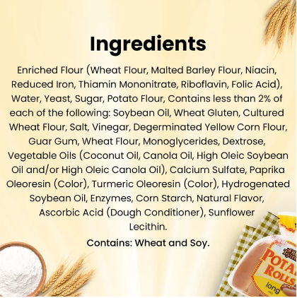 Enriched Flour (Wheat Flour, Malted Barley Flour, Niacin, Reduced Iron, Thiamin Mononitrate, Riboflavin, Folic Acid), Water, Sugar, Dehydrated Potatoes, Yeast, Contains 2% Or Less of Each of The Following: Soybean Oil, Wheat Gluten, Salt, Cultured Wheat Flour, Guar Gum, Wheat Flour, Vinegar, Ascorbic Acid (Dough Conditioner), Enzymes.