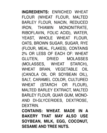 Enriched Wheat Flour (Wheat Flour, Malted Barley Flour, Niacin, Reduced Iron, Thiamin Mononitrate, Riboflavin, Folic Acid), Water, Whole Wheat Flour, Oats, Yeast, Brown Sugar, Sugar, Rye (Flour, Meal, Flakes), Contains 2% or Less of Each of: Dried Molasses (Molasses, Wheat Starch), Wheat Bran, Vegetable Oil (Canola Oil or Soybean Oil), Wheat Gluten, Salt, Caramel Color, Cultured Wheat (Starch or Flour), Malted Barley Extract, Malted Barley Flour, Guar Gum, Mono and Diglycerides, Dextrose.
