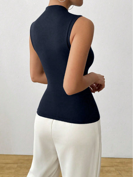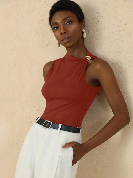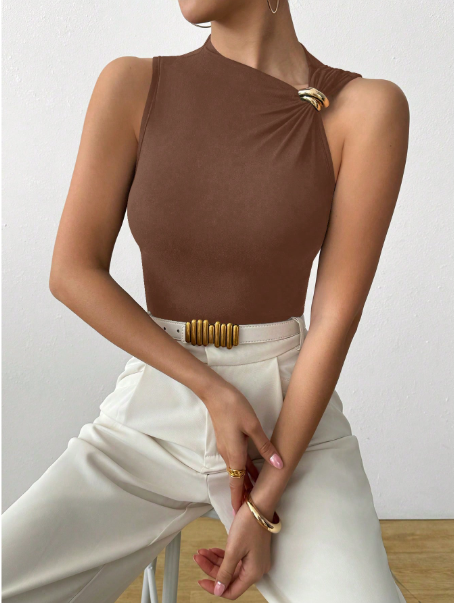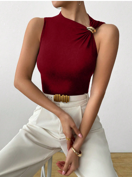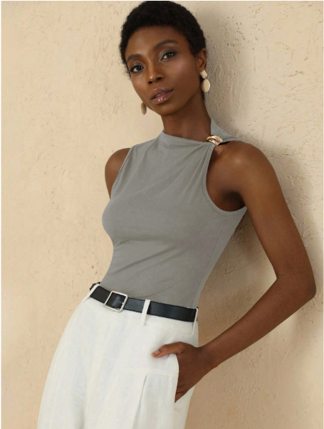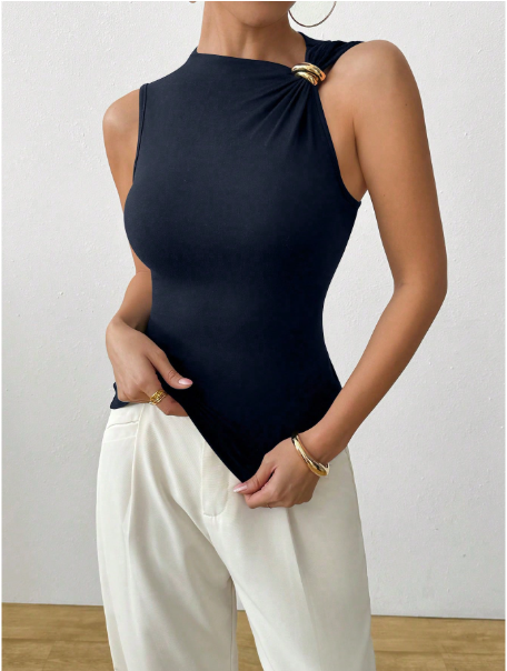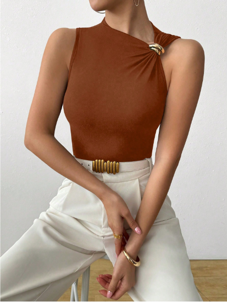 Product Note: This elegant solid-color tank top features a chic asymmetric neckline and eye-catching metal decoration on the shoulder for a modern, refined touch. Its sleek, comfortable fit flatters your silhouette, making it perfect for both casual and dressy occasions. Stylish and versatile, it adds effortless sophistication to any outfit.