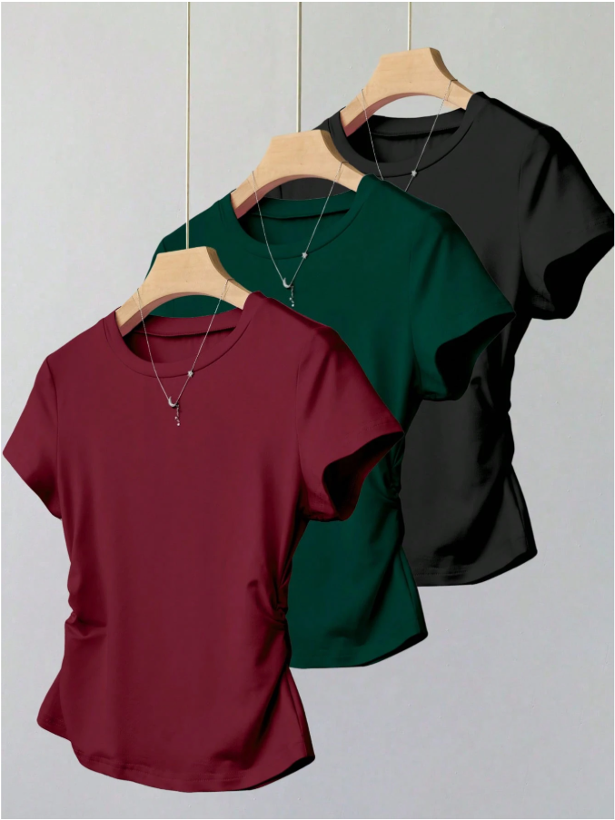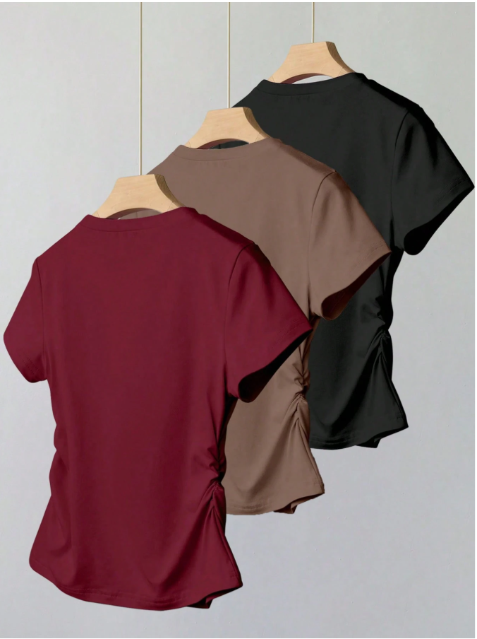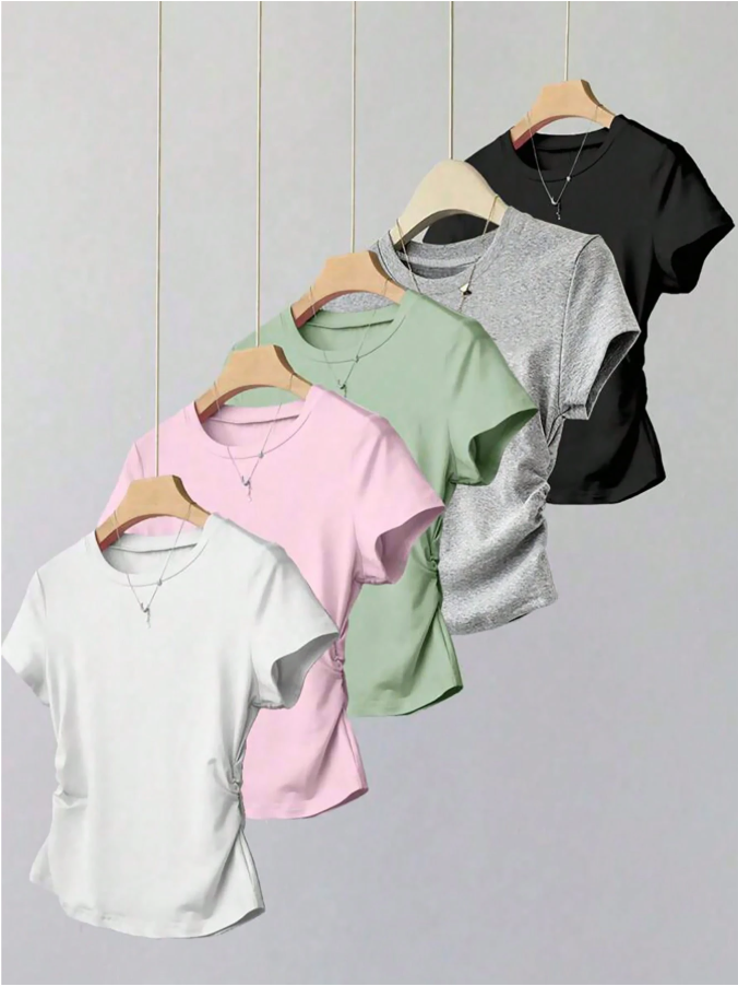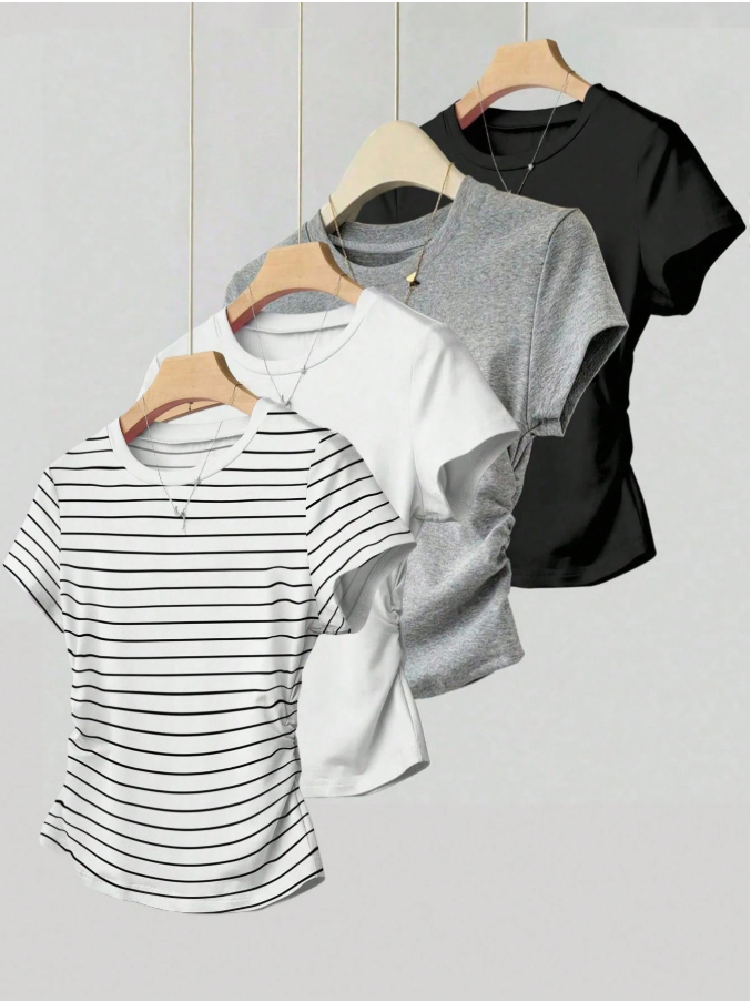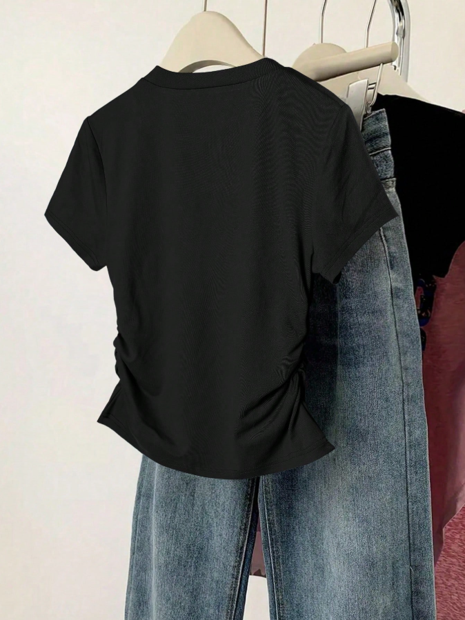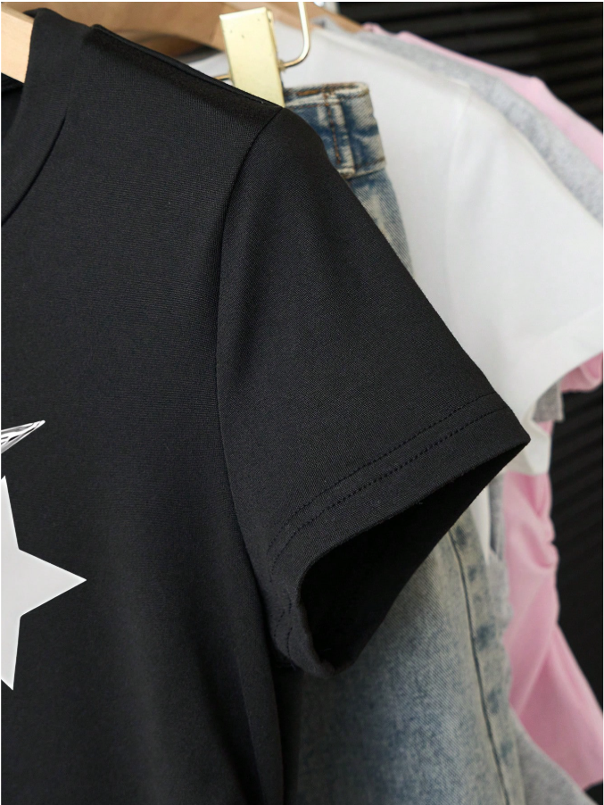 Product Note: Teen Girl Minimalist Metallic Star Print Short Sleeve T-Shirt, featuring a chic cinched waist for a flattering and stylish fit. This versatile top combines comfort with a trendy star print, perfect for summer holidays, outings, and everyday wear. Lightweight and easy to style, it pairs effortlessly with jeans, shorts, or skirts, making it a must-have wardrobe essential.