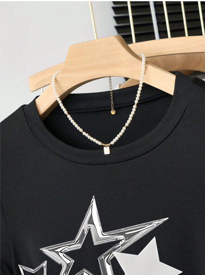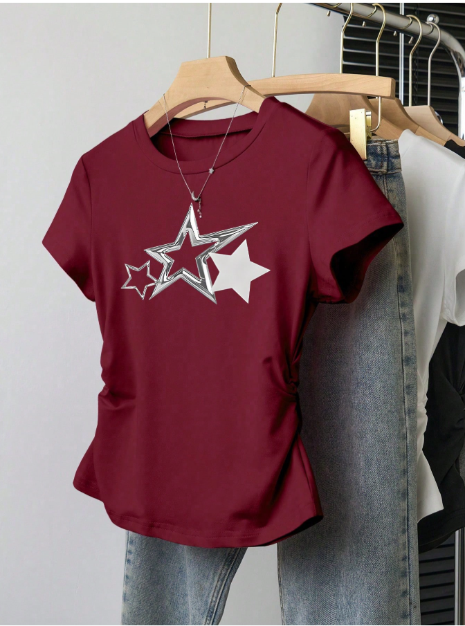 Teen Girl Minimalist Versatile Metallic Star Print Cinched Waist Short Sleeve T-Shirt Summer Holiday