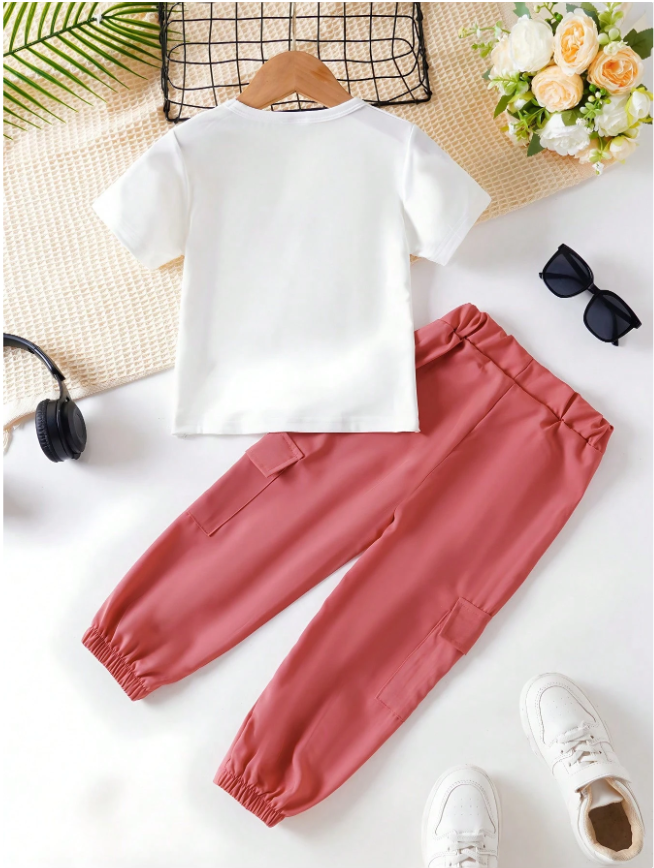 Product Note: This 2-piece set includes a stylish letter-printed T-shirt paired with comfortable work pants, designed for young girls. Perfect for spring and summer, it offers a fashionable and breathable outfit ideal for outdoor activities, casual outings, and everyday wear.