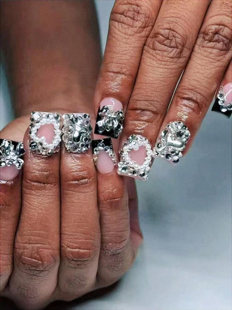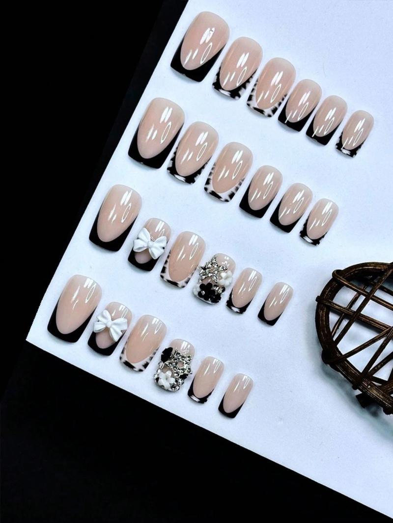 Product Note: 24Pcs Set French Style Black & White Tie Dye Polka Dot Press-On Nails, Reusable, With Bowknot, Star Rhinestones, Cute & Chic, Suitable For Dates, Spring, New Year, Christmas, Daily, Birthday, Festival, Spring/Summer New Arrival Nail Supplies Nails