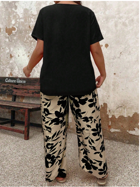 Product Note: 2-piece plus-size womenโs set features a solid color top with a stylish asymmetrical hem paired with vibrant printed contrast-color pants. Designed for comfort and standout appeal, it offers a flattering fit and effortless versatility. Perfect for casual outings or everyday wear, this chic set blends modern design with easy, confident style.