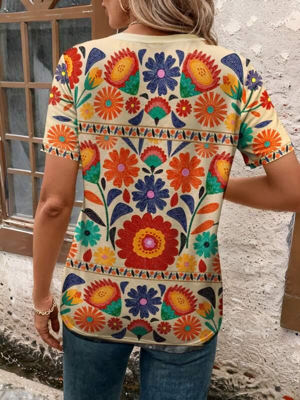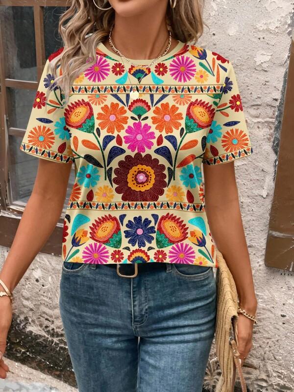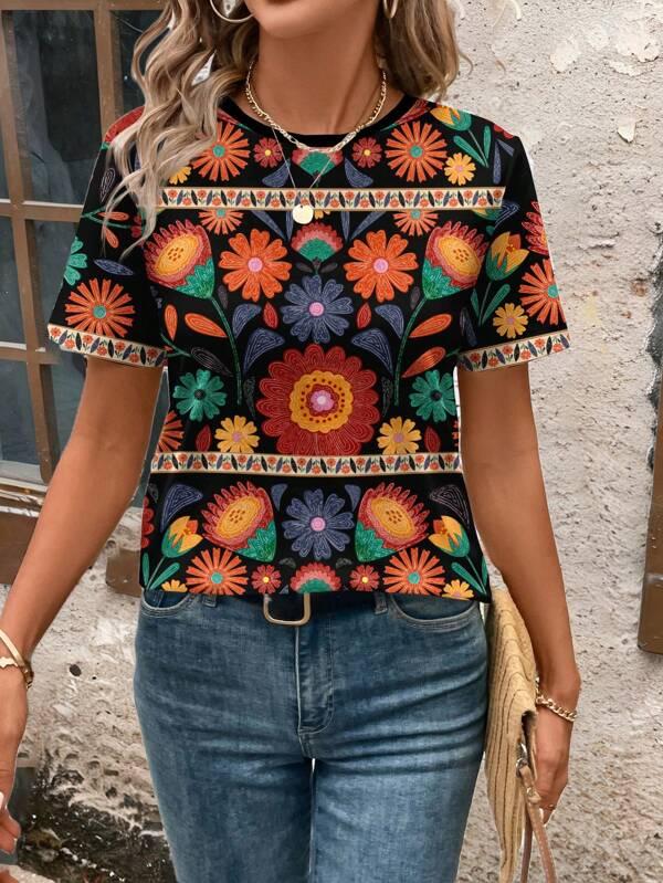 Casual Simplistic Floral Round Neck Loose Fit Women T-Shirt Suitable For Going Out