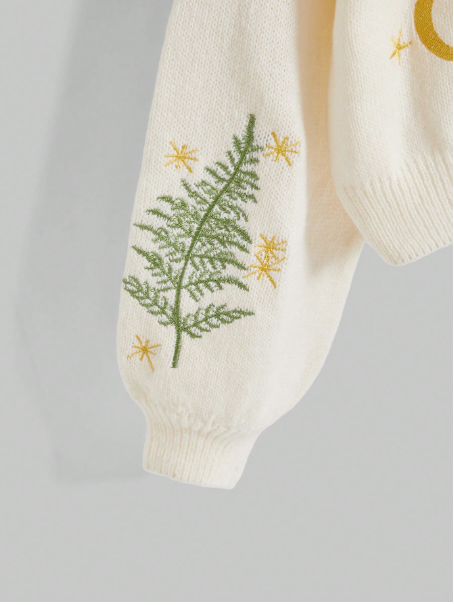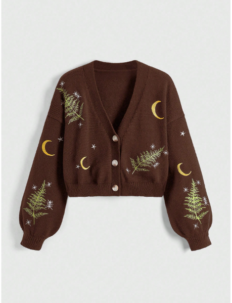 Fairycore Plus Size Women's Leaf & Moon Embroidered Long Sleeve Cardigan, Apricot Color/Winter