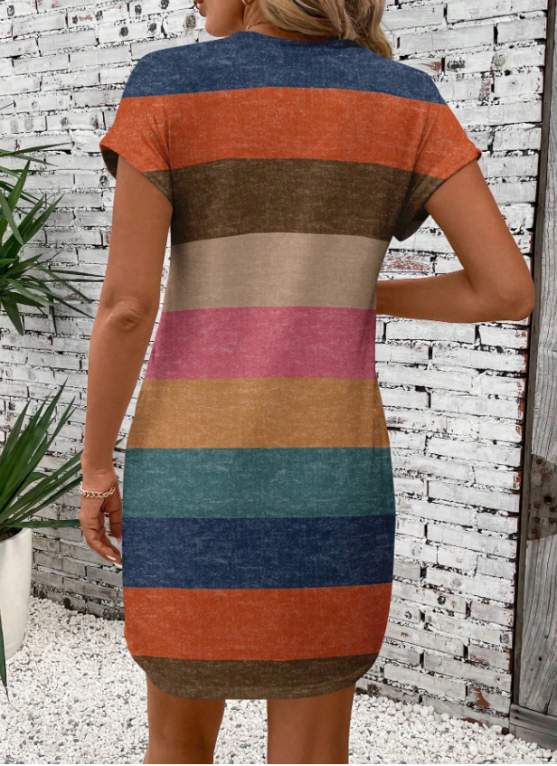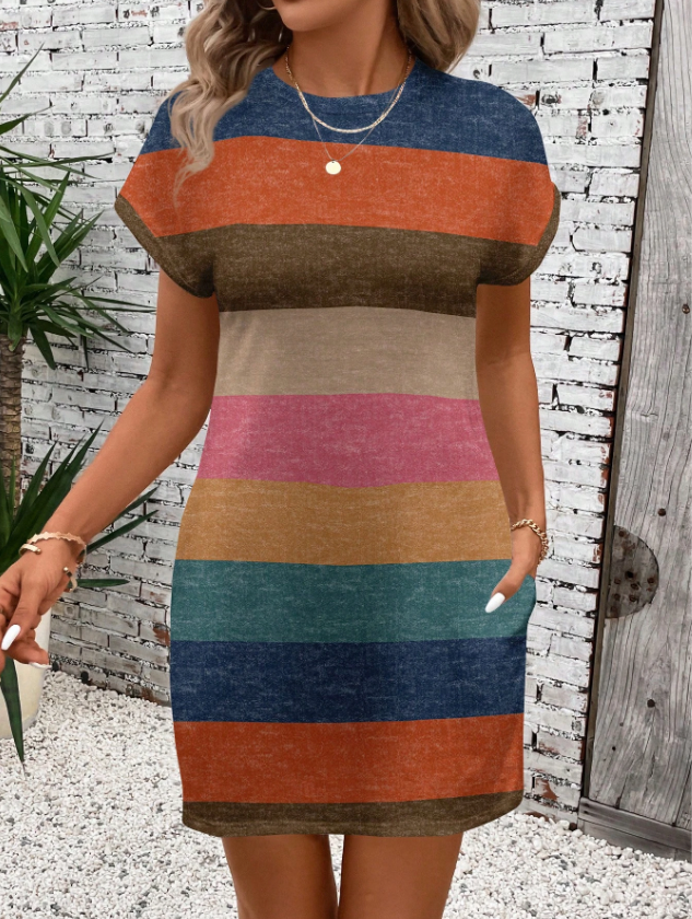 Product Note: This is a casual, multicolor striped tee featuring a round neck and batwing short sleeves. It has an oversized fit, mini length, and a natural mid-waist line. Made from knitted fabric with medium stretch, it's semi-sheer, unlined, and includes a pocket.