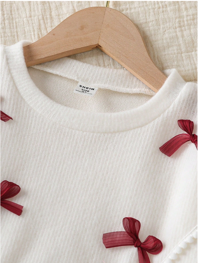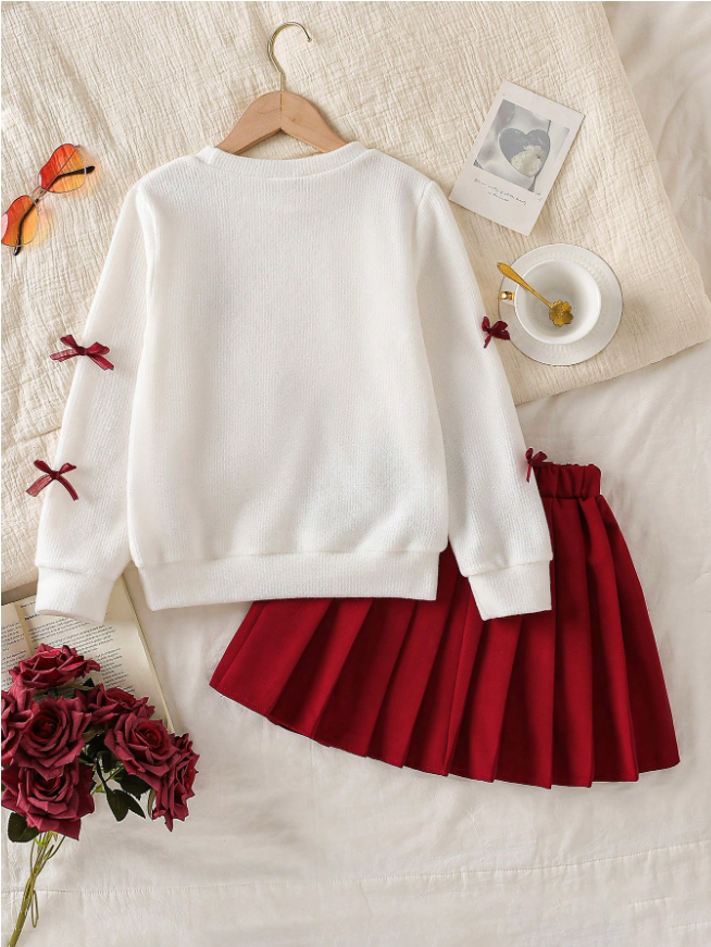Genkimix Kids 2pcs/Set Tween Girl Christmas Autumn/Winter Korean Fashion Chic Girls Outfit, Bow Decor Sweet Round Neck Long Sleeve Top + Pleated Skirt 2 Pieces