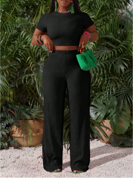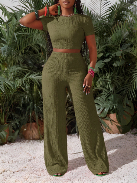 New Casual Basic Sports Style Spring And Summer Round Neck Short-Sleeved Truncated T-Shirt + Wide-Leg