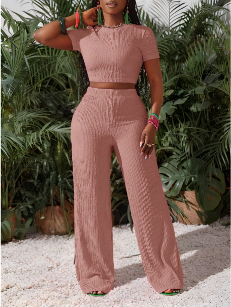 Product Note: This casual sports-style two-piece set includes a round-neck, short-sleeved truncated T-shirt paired with wide-leg super-long pants for effortless spring and summer comfort. Crafted from rose-red striped textured knitted fabric, it offers a stylish yet relaxed fit.