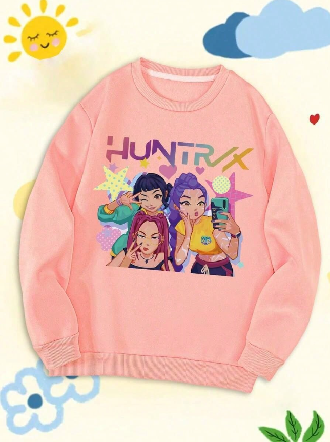 Pink Cartoon Style Fashionable Trio Printed Autumn And Winter Season Versatile Casual Outdoor Children's Clothing For Little Girls Or Boys, Warm Round Neck Hoodie, Durable, Soft And Comfortable, Skin Friendly Children's Clothing Top Can Be Given As A Gift