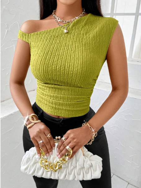 Product Note: This solid asymmetrical neck ruched top combines modern style with a flattering, feminine fit. The unique neckline adds a chic edge, while the ruched detailing enhances your silhouette comfortably. Perfect for casual outings, work, or evening looks, it pairs beautifully with jeans, skirts, or trousers for effortless, versatile style.