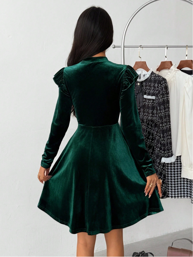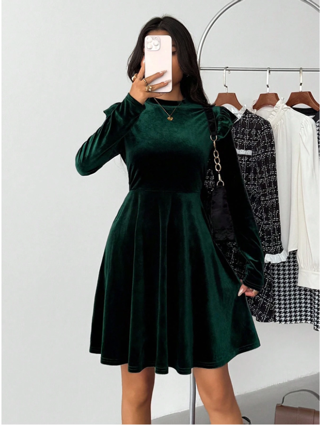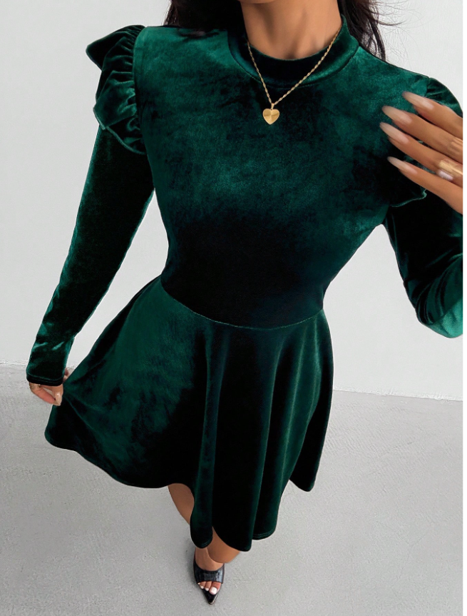 Product Note: This Teen Girl Solid Color Velvet Knit Ruffle Trim Long Sleeve Dress is a cozy, stylish, and charming wardrobe essential designed especially for the cooler months of autumn and winter. Crafted from soft velvet-knit fabric, it offers a warm, gentle feel against the skin while maintaining a polished, elegant appearance suitable for everyday activities.