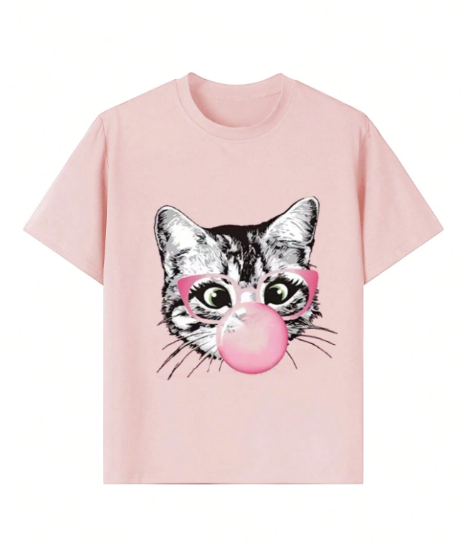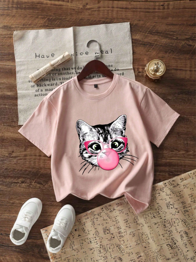 Tween Girl Casual Fun Print Round Neck Short Sleeve T-Shirt, Summer Top