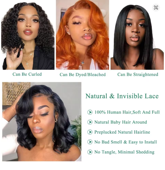 Body wave bob wig human hair lace details: pre plucked with natural hairline. no shedding, tangle free, no smell, can be dyed, bleached, and restyled. no need to cut the lace, save your time, change your hairstyle in minutes, just wear to go!