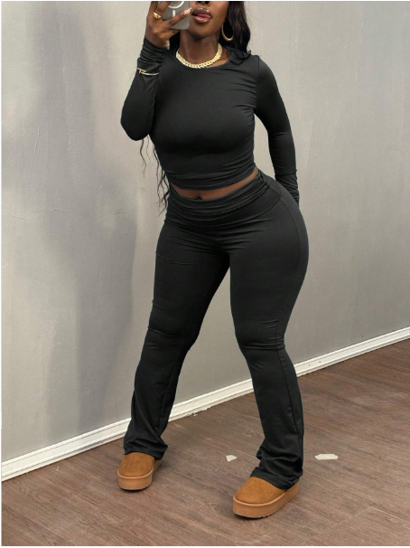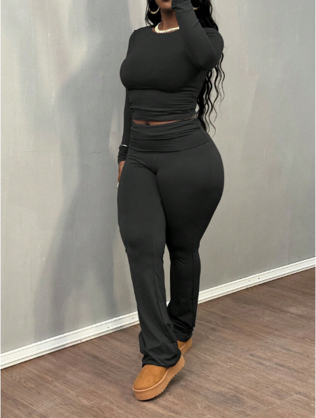 Product Note: This plus-size two-piece set features a ruched, fitted cropped long-sleeve T-shirt paired with high-waist, flared-leg pants for a flattering silhouette. Made in a solid color for easy styling, it offers comfort, stretch, and versatility. Perfect for spring and autumn, it transitions effortlessly from casual outings to chic, everyday looks.