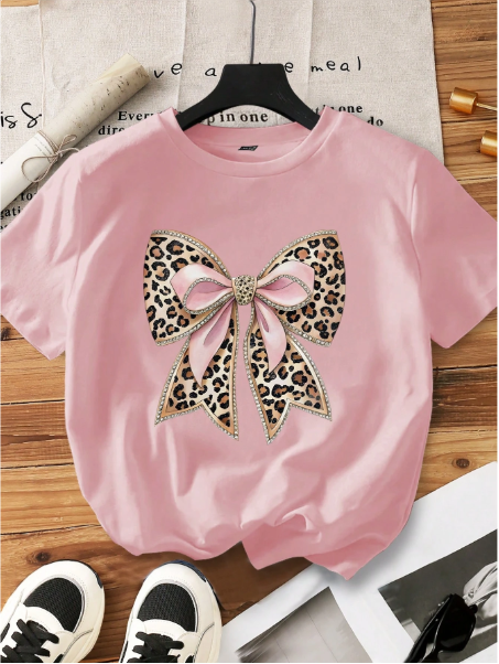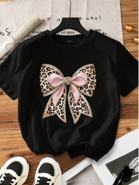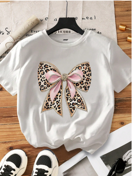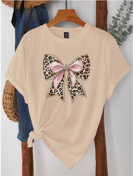 Product Note: plus-size womenโs summer T-shirt features a trendy leopard print and a cute bow detail, perfect for casual wear. Designed with short sleeves and soft, breathable fabric, it ensures comfort in warm weather. Ideal for daily outings, vacations, or relaxed weekends, it pairs effortlessly with jeans, shorts, or skirts for a stylish and playful summer look.