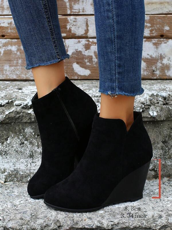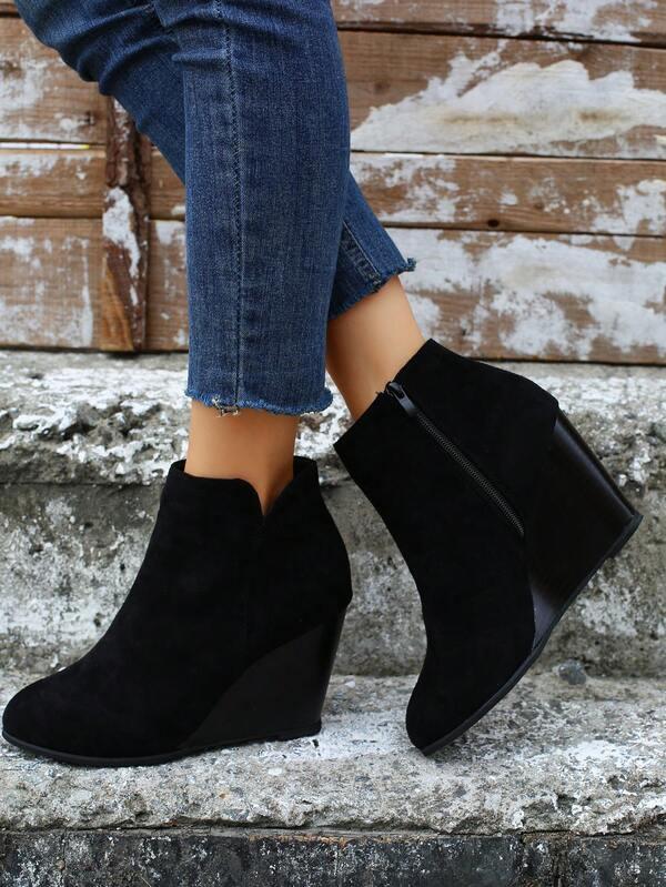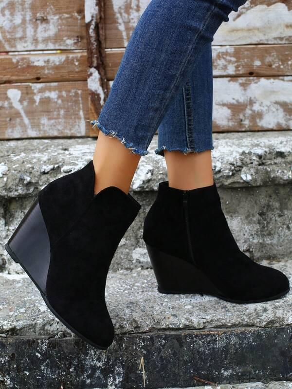 Women's Fashion Nude Boots, Wedge Heel Thick Platform Ankle Boots, Black Side Zipper Daily Wear Shoes