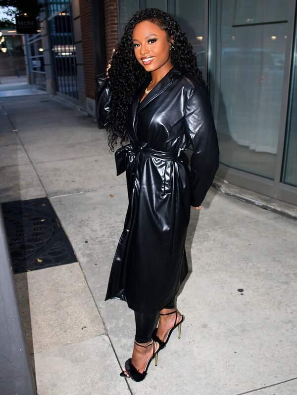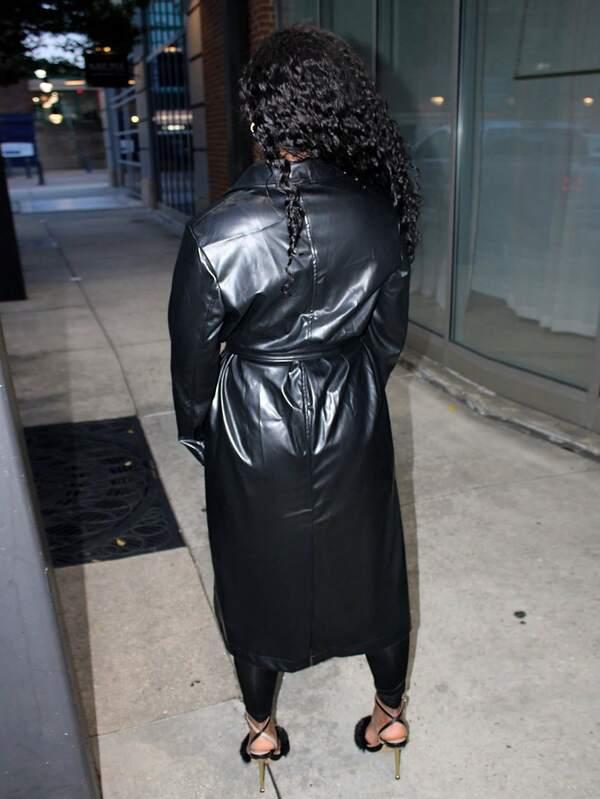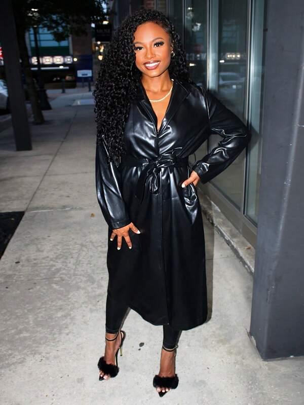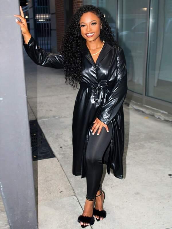 Women's Loose Solid Color PU Long Jacket With Belt, Casual Street Style Windbreaker For Autumn & Winter