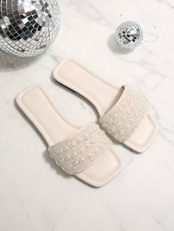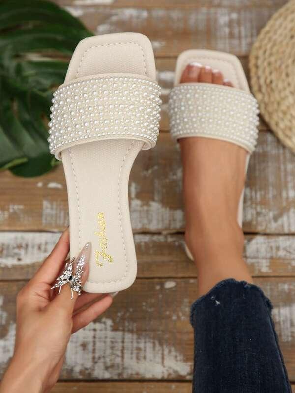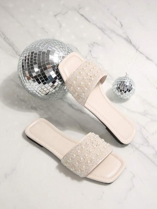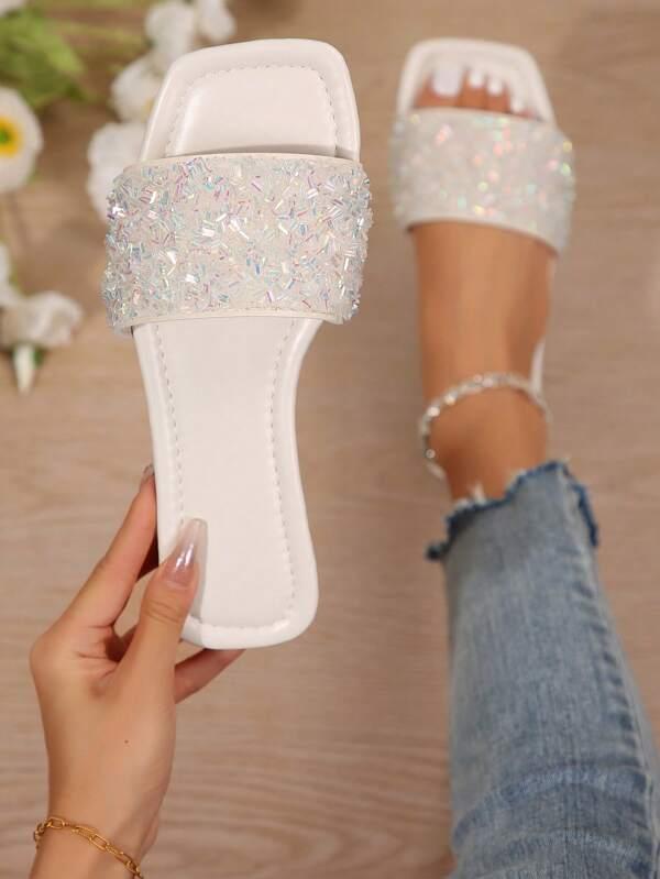 Product Note: Stylish white sandals with a flattering square toe and sparkling strap. The versatile flat design is perfect for dressy events, the beach, or comfortable home wear.